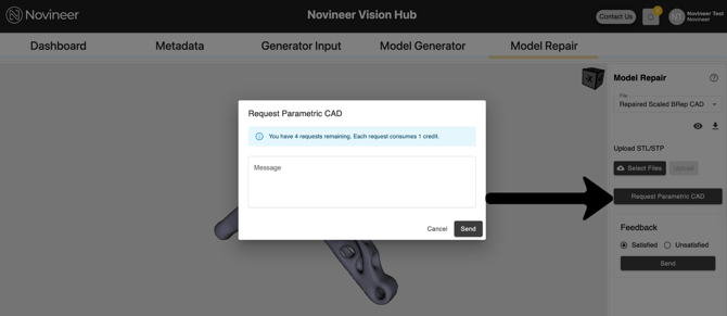 Parametric Requests: If you need a more editable output, click Request Parametric CAD and provide a short note describing the dimensions or details needed. You can track the status of this request in the Dashboard.